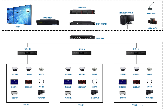 检察院、高清数字审讯系统:在满足司法机关“全程同步”、“程序规范”、“客观真实”、“严格保密”四条审讯原则础上,通过加强计算机技术、图像数字化技术和信息技术的应用,实现对审讯室的标准化建设。利用现有的网络对审讯过程进行有的监督和管理,不仅提高了司法机关的办案率,更强化了法律监督能力。